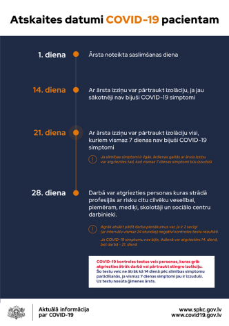 Līdz ar to Covid-19 pacienti ar ārsta lēmumu stingro izolāciju varēs pārtraukt, neveicot kontroles testus - 14. dienā, ja jau sākotnēji nebūs bijuši slimības simptomi un 21. dienā, ja vismaz nedēļu nav bijuši slimības simptomi.