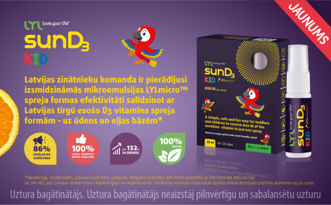 Latvijas iedzīvotāju atzinību ieguvis vietējā farmācijas zīmola produkts - LYLsunD3 spreja formas D vitamīns, kura unikālā mikroemulsijas forma padara to īpaši efektīvu. Ir pārbaudīts, ka lietotāji, kuru D vitamīna līmenis bija zem normas vai kritiski zems un kuri izvēlējās LYLsunD3, optimālo D vitamīna līmeņa robežu sasniedza viena mēneša laikā!