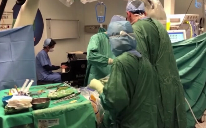 Video kadros redzams, ka ārsts netālu no saviem kolēģiem, kuri veic operāciju, spēlē klavieres.