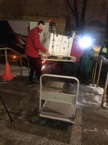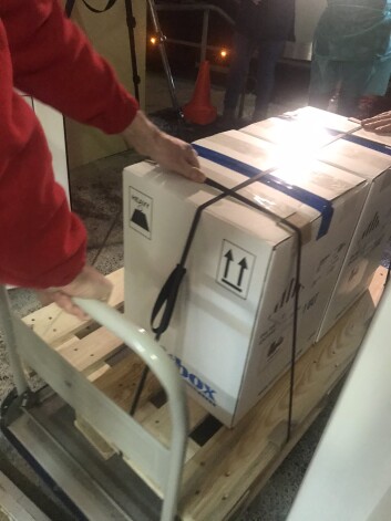 "Vakcīna ir klāt!!!" tviterī paziņojusi ministre, pievienojot četrus fotoattēlus, kuros redzams, kā no kravas automašīnas ēkā tiek nestas kartona kastes. Uzraksti uz kastēm liecina, ka tās paredzētas tādu kravu pārvadāšanai, kuras svarīgi uzturēt noteiktā temperatūrā. Kastēs temperatūras uzturēšanai tiek izmantots sausais ledus, un katra no tām sver 20,5 kilogramus, liecina uzraksti.