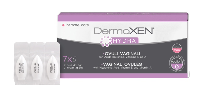 DermoXEN® HYDRA vaginālās svecītes mazina kairinājumu, niezi, dedzināšanas sajūtu un dispareūniju, ko izraisījusi vāja vaginālā sekrēcija vai tās neesamība. Pesāriju sastāvā ir: