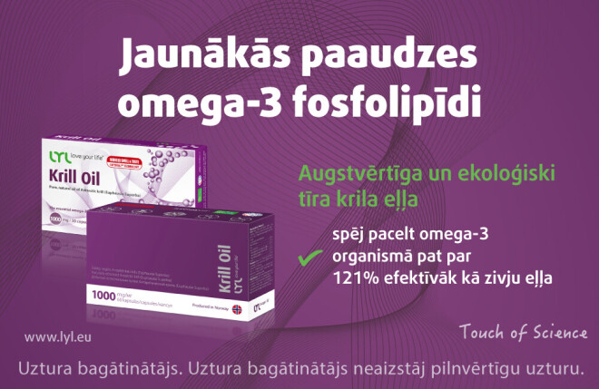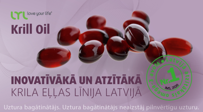 Devos uz aptieku, lai iegādātos omega-3 uztura bagātinātāju un biju patīkami pārsteigta, kad ieraudzīju, ka Latvijas farmācijas zīmols LYL love your life® vēl bez mana tik ļoti iemīļotā LYLsunD3 vitamīna, piedāvā arī krila eļļu - LYL Krill Oil. Tās sastāvā ir jaunākās paaudzes omega-3 fosfolipīdi, kas, kā man izstāstīja zinoša farmaceite, labāk uzsūcas cilvēka organismā. Pētījumos apliecināts, ka krila eļļā esošo omega-3 fosfolipīdu formu organisms atpazīst uzreiz un ir momentā spējīgs to izmantot, iekļaujot šūnās un pārnesot uz audiem un orgāniem – smadzenēm, sirdi, acīm, aknām, ādu un locītavām. Es pati izvēlējos lietot krila eļļu tāpēc, ka tas ir bioloģiski tīrs produkts, jo mazie krili dzīvo vistīrākajos Antarktikas ūdeņos un netiek mākslīgi audzēti. Tas, kas mani pārliecina to lietot ir arī fakts, ka krila eļļā ir sastopams dabā spēcīgākais antioksidants astaksantīns, kā arī holīns (B4 vitamīns), E un A vitamīni, flavonoīdi, kalcijs un magnēzijs.3