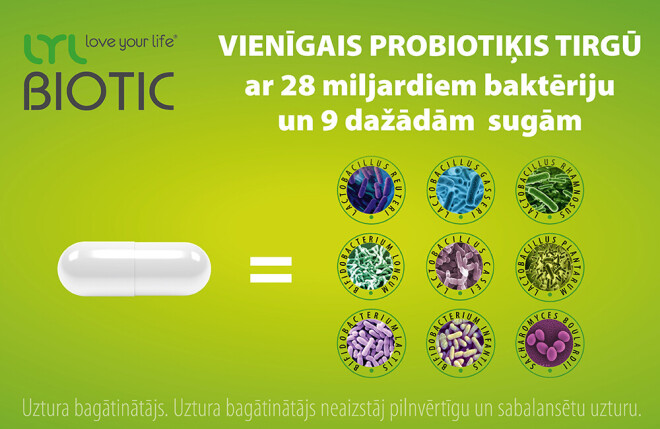 Painteresējoties Latvijas aptiekās par tur nopērkamo probiotiķu izvēli, uzmanību piesaista pašmāju zīmola LYL love your life ® baktēriju komplekss LYLBIOTIC – pirmkārt, pārsteidz tas, ka vienā kapsulā sakoncentrēti 28 (!) miljardi 9 sugu baktēriju (pienskābo baktēriju, bifidobaktēriju, Saccharomyces boulardii). Papildus tam LYLBIOTIC sastāvā probiotikas ir bagātinātas ar prebiotiķi inulīnu. Otrkārt, kapsulu īpašais DRcaps™ apvalks sargā baktēriju dzīvotspēju, ļaujot tām aktivizēties tikai pēc nokļūšanas zarnās, nevis izšķīstot kuņģa sulā.