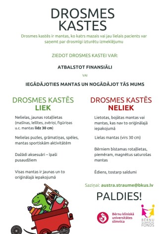“Drosmīgi izturēta procedūra nenozīmē to, ka bērns vai pusaudzis izrādījis kādu īpašu bezbailību. Drosme slimnīcā nozīmē vienkārši tur būt un piedzīvot visu, kas ar to saistīts. Tāpēc mēs sakām lielu paldies visiem līdzšinējiem Drosmes kastes atbalstītājiem par ziedotajām mantām vai līdzekļiem to iegādei, un aicinām uzņēmumus un privātpersonas atbalstīt šo iniciatīvu arī turpmāk, lai Drosmes kastes būtu pilnas visa gada garumā,” stāsta Bērnu klīniskās universitātes slimnīcas Pacientu pieredzes un klientu vadības daļas projektu vadītāja Austra Straume.