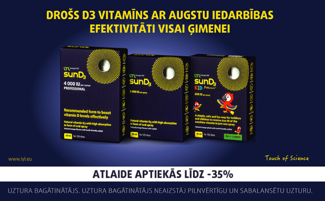 Protams, mans, rūpīgas mammas, tālākais ceļš veda uz aptieku, lai papildinātu D3 vitamīna rezerves. Nebiju īsti droša, kāda veida vitamīns būtu vislabākais un spētu apmierināt ģimenes locekļu prasības, kas katram ir savas: vīram ir svarīgi, lai vitamīniem būtu ātra un efektīva iedarbība, dēlam nepatīk tabletes un kapsulas, mazulītei der “zālītes, kas labi garšo”, savukārt man ir būtiski, lai tās būtu izdevīgas ģimenes budžetam. Noskaitot savas prasības farmaceitei aptiekā, nodomāju – hm, kas nu būs? Bet viņa, gluži vai sagatavojusies manam vēlmju sarakstam, vēsā mierā atbildēja: “Tad jums ir viens risinājums – LYL sunD3 sprejs.” Noliekot uz letes tumšzilu kārbiņu, viņa vēl piemetināja, ka šiem vitamīniem ir Latvijā veiktos pētījumos pierādīta darbības efektivitāte – tie iedarbojas četras reizes jaudīgāk nekā citi šāda veida produkti [3].