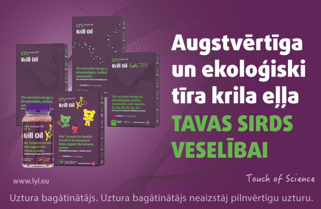 Latvijā jau gandrīz desmit gadus ir pieejama krila eļļa, ko pēc Latvijas farmācijas zīmola LYL love your life® pieprasījuma ražo pasaulē visaugstāk vērtētākais un zināmākais jūras bioproduktu ieguvējs un ražotājs no Norvēģijas – Aker BioMarine ASA. LYL Krill Oil ir 100% dabiska krila eļļa, iegūta no Antarktiskajiem kriliem, kas tiek zvejoti zemeslodes tīrākajos ūdeņos Atlantijas okeānā. Ražotājs garantē, ka tieši šī konkrētā krila eļļa ir pilnīgi brīva no radioaktīvajām vielām un citiem ķīmiskiem piemaisījumiem. Svarīgi, ka pateicoties jaunākajām tehnoloģijām, LYL Krill Oil ir bez specifiskās zivju smaržas, pēcgaršas un atraugas.