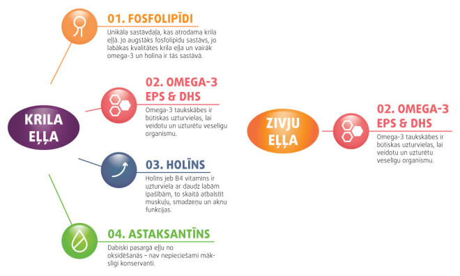 Krila eļļa, kuru 20 gadus atpakaļ vēl pat nezinājām, šodien ir sevi pierādījusi kā efektīvu, dabisku un ilgtspējīgu atbalstu organismam. Pirms dažām nedēļām Latvijas mediju telpā publicētais pētījums, kas tiek aprakstīts kā līdz šim iespaidīgākais klīniskais pētījums par omega-3 ietekmi sirds slimnieku grupā un uzrāda krila eļļas spēju būtiski uzlabot sirds veselības rādītājus, aktualizēja jautājumu - ar ko tad krila eļļa atšķiras un ir pārāka par citiem omega-3 avotiem? Atbilde ir vienkārša - ar tās sastāvu un formu.