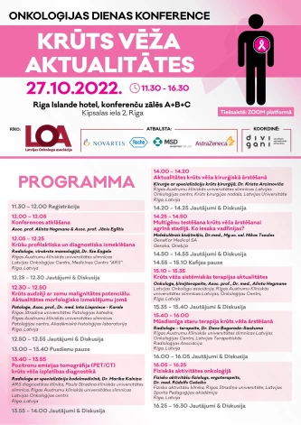 Ceturtdien, 27.oktobrī, Latvijas Onkologu asociācija organizē Onkoloģijas dienas konferenci “Krūts vēža aktualitātes” ar mērķi aktualizēt slimības diagnostiku un pievērst uzmanību tās ārstēšanai.