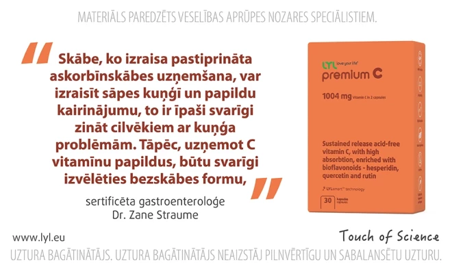 Devos uz aptieku, un, nevēloties mocīties ar nekomfortablajām sajūtām kuņģī un iedzīvošanos izsitumos, nolēmu izrunāties arī ar farmaceiti. Aptiekāre man apstiprināja, ka LYL premium C ir bezskābes formā un šim produktam ir ilgstoša iedarbība. Respektīvi, pateicoties īpašai tehnoloģijai, tas organismā uzsūcas pakāpeniski, garantējot augstāko iedarbības efektivitāti – uzņemts no rīta, C vitamīns turas optimālā līmenī asinīs visu dienu.