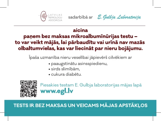 Bezmaksas albumīnūrijas skrīninga projekts ir plānots līdz 2023.gada decembrim, to organizē Latvijas Nefrologu asociācija sadarībā ar “E.Gulbja Laboratoriju”.