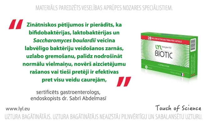 Vēdera daktere īpaši uzsvēra, ka, izvēloties probiotikas, jāpievērš uzmanība tam, kāds ir kapsulas apvalks, jo ne visas labās baktērijas kapsulās ir aizsargātas no agresīvās kuņģa pH vides un tādējādi nevar nokļūt zarnās – īstajā vietā, kur tām ir jāaktivizējas. Arī tāpēc viņa saviem pacientiem iesaka LYLBIOTIC, jo patentētais DRcaps™ apvalks garantē baktēriju kultūru dzīvotspēju un ļauj tām aktivizēties tikai pēc nokļūšanas zarnās. Turklāt inovatīvais kapsulas veids un vielas izgatavošanas tehnoloģija nodrošina iespēju šīs labās baktērijas neturēt ledusskapī – tās var uzglabāt istabas temperatūrā līdz 25 0C grādiem un ērti paņemt līdzi, dodoties ikdienas gaitās.