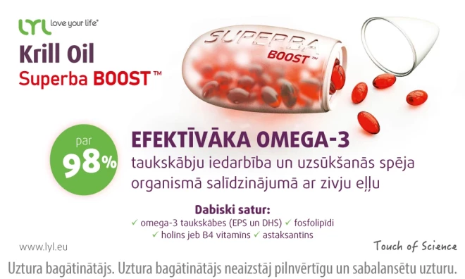 Viņa man ieteica izvēlēties krila eļļu, kas sniedz ne tikai omega-3 taukskābes fosfolipīdu formā, kas labāk uzsūcas organismā, bet arī ar holīnu (B4 vitamīnu). Daktere pati izvēlas un arī saviem pacientiem iesaka pašmāju zīmola produktu LYL Krill Oil Superba BOOST™, kam ir arī Eiropas Pārtikas nekaitīguma iestādes (EFSA) apstiprināti četri veselības ieguvumi – aknām, sirdij, smadzenēm un redzei –, un tā uzturošā dienas deva pieaugušajiem ir 1–2 kapsulas dienā. Viņa vēl piebilda, ka Superba BOOST™ kapsulas ir viegli norijamas, mazas un maigas un pēc to uzņemšanas nepaliek raksturīgā zivju pēcgarša vai citas nepatīkamas gremošanas problēmas.