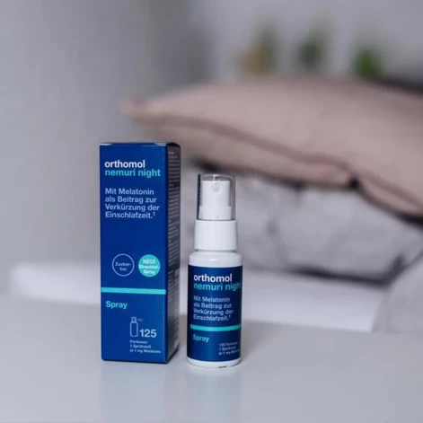 Tikai viens pūtiens Orthomol® Nemuri night spray pirms miega. Melatonīns ātri uzsūkcas caur mutes gļotādu un palīdz saīsināt iemigšanas laiku. Ar patīkamu piparmētru garšu, piemērots vegāniem. Nesatur cukuru un alkoholu.