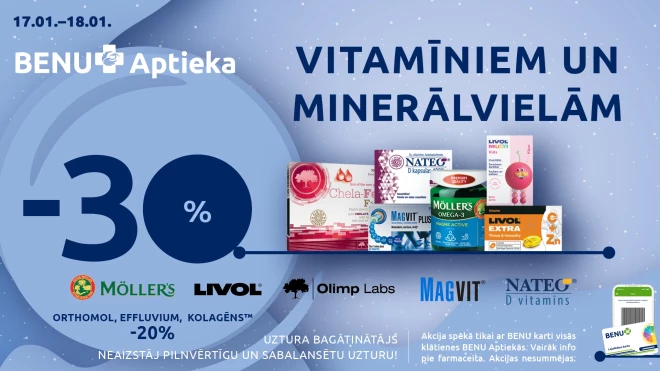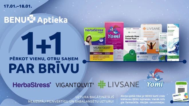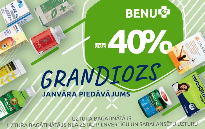 Sev piemērotos līdzekļus izvēlieties BENU Aptiekās! Visu mēnesi BENU Aptiekās Grandiozas atlaides uztura bagātinātājiem organisma stiprināšanai un imunitātei, izmantojot BENU karti. Turklāt tikai divas dienas, no 17. līdz 18. janvārim, BENU Aptiekās notiek lielpārdošana – 30 %, 40 % un pat 50 % atlaides dažādiem līdzekļiem veselībai un skaistumam.