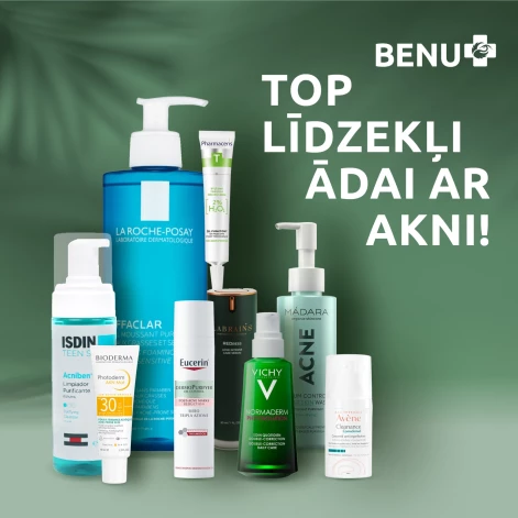- ISDIN Acniben attīrošas putas aknes mazināšānai – mazina pārmērīgu taukainumu un attīra ādu, palīdzot samazināt ādas bojājumus un apsārtumu.