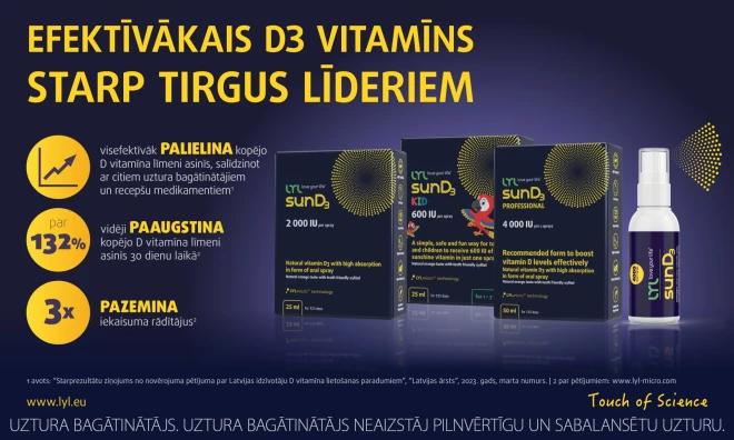 Apzinoties, ka ģimenes ārstei ir absolūta taisnība, taujāju, kuru D vitamīnu izvēlēties. Viņa ieteica Latvijas farmācijas zīmola LYL love your life® produktu LYLsunD3, kas ir iedarbībā efektīvākais D3 vitamīns. Viņa stāstīja, ka tā tirgus līdera pozīciju apstiprina četri Latvijā veikti pētījumi: 1) produkts spēj paaugstināt kopējo D vitamīna līmeni asinīs vidēji par 132 % tikai 30 dienu laikā un noturēt to; 2) spēj pacelt un noturēt D vitamīna līmeni asinīs 30 dienu laikā vidēji par 197 % personām ar D vitamīna deficītu; 3) uzsūkšanās jaudā četras reizes pārspēj citus tirgū esošos D vitamīna produktus spreja formā uz eļļas un ūdens bāzes; 4) tam ir pierādīta efektivitāte, atveseļojoties pēc elpceļu infekcijām.