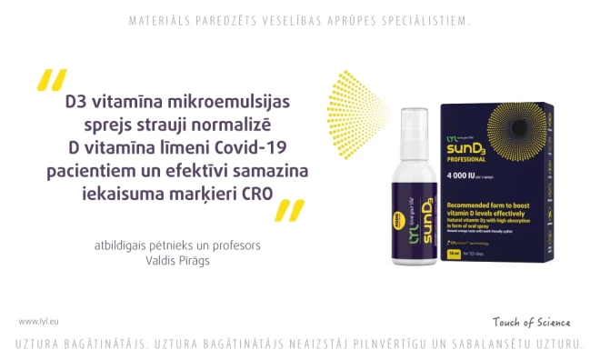 Te gan ir neliela nianse – vajadzētu izvēlēties LYLsunD3 spreja formas D3 vitamīnu, jo pētījumā ir pierādīts, ka šim sprejam ir ietekme uz CRO līmeni. To pierāda Paula Stradiņa Klīniskajā universitātes slimnīcā profesora Valda Pīrāga vadībā veikts klīnisks pētījums, kurā noteiktas D vitamīna uzkrāšanās organismā īpatnības stacionētiem Covid-19 pacientiem. Secināts, ka D vitamīna spreja forma ir ieteicama straujai D vitamīna deficīta novēršanai pacientiem ar Covid-19 pneimoniju un citām akūtām augšējo elpceļu infekcijas saslimšanām, kā arī novērots, ka LYLsunD3 sprejs par 3 reizēm spēj pazemināt CRO līmeni pacientiem.