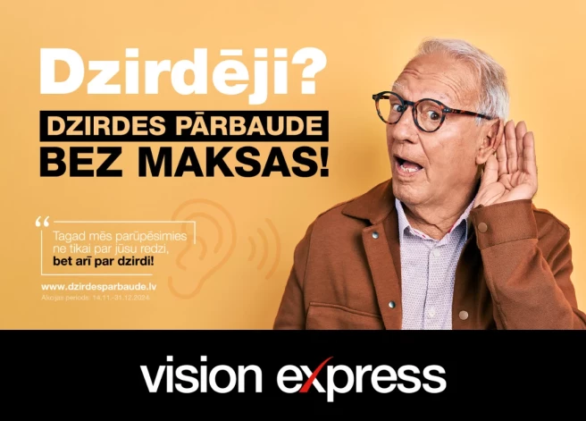 Rūpējies par savu dzirdes veselību un izmanto iespēju no 14. novembra līdz 31. decembrim pieteikties uz bezmaksas dzirdes pārbaudi www.dzirdesparbaude.lv Vision Express dzirdes centros Rīgā (Brīvības ielā 90 un i/c Olimpia), Liepājā (Kārļa Zāles laukumā 6) vai Jelgavā (Lielā iela 14-16).