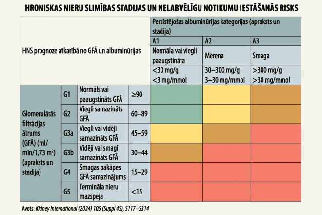 – Hroniskas nieru slimības kritēriji ir strukturālas vai funkcionālas izmaiņas nierēs, kas pastāv ilgāk par trīs mēnešiem ar ietekmi uz cilvēka veselību. Savukārt pēc šiem diviem rādītājiem – albumīna un kreatinīna attiecības urīnā un glomerulārās filtrācijas ātruma tiek noteikta hroniskas nieru slimības stadija un nelabvēlīgu notikumu iestāšanās risks. Ar nelabvēlīgiem notikumiem tiek saprasti: hroniska nieru mazspēja gala stadijā, akūta nieru mazspēja, mirstība no kardiovaskulāriem notikumiem un mirstība no jebkura cēloņa. To uzskatāmi parāda tabula, kura labāk nekā vārdi ieskicē riskus un stāvokļus, cik viegli vai smagi viss ir atbilstoši GFĀ un mikroalbuminūrijas līmeņiem. Tabula parāda, kā aug riski cilvēkam, kad viņam samazinās glomerulārās filtrācijas ātrums no 100 līdz pat 15 ml/min, kad jau ir vajadzīga dialīze, un kad pieaug albuminūrija... Tabulā zaļā krāsa apzīmē zemu risku, dzeltenā – mērenu risku, brūni oranžā – augstu risku un sarkanā – ļoti augstu risku. Tas ir tas, ko mums bieži arī ģimenes ārsti prasa skaidrot. Šādas tabulas atrodamas gan Latvijas nefrologu asociācijas mājaslapā, gan starptautiskos nefrologu informācijas avotos.