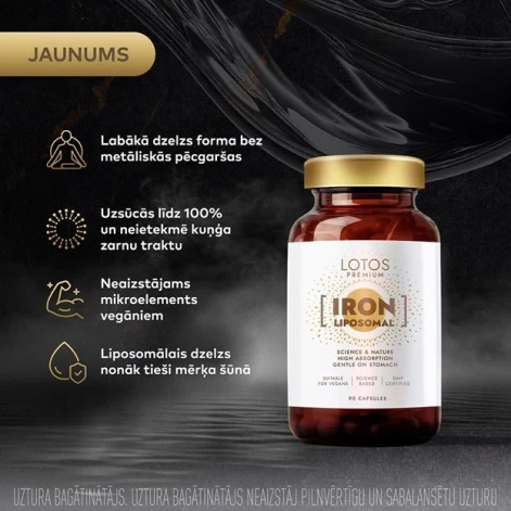 Latvijas farmācijas uzņēmuma “Lotos Pharma” inovatīvais produkts LOTOS PREMIUM Liposomal Iron ir veidots, izmantojot modernāko liposomālo tehnoloģiju. Tas nodrošina maksimālu dzelzs uzsūkšanos, vienlaikus saudzējot kuņģi un izvairoties no biežāk sastopamajām blakusparādībām, piemēram, aizcietējumiem, sliktas dūšas vai metāliskas pēcgaršas.