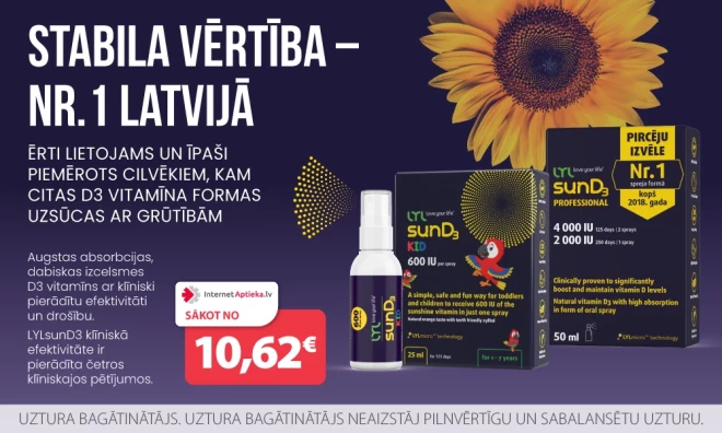Taujāju speciālistei, kādu D3 vitamīna formu vislabāk lietot vasarā – lai nav par daudz un lai ir droši –, un viņa ieteica to pašu, ko lietoju rudens un ziemas sezonā. Un tas ir Latvijas farmācijas zīmola LYL love your life® sprejs LYLsunD3, kas ir ne tikai ļoti ērti lietojams – tikai viens pūtiens zem mēles –, bet arī ar zinātniski pierādītu efektivitāti. Es to lietoju jau vairākus gadus, jo mani pārliecina klīniskie pētījumi: tas četras reizes pārspēj citus tirgū esošos D3 vitamīnus spreja formā uz eļļas un ūdens bāzes, jo šī spreja mikroemulsijas formula nodrošina ātru un efektīvu D3 vitamīna uzsūkšanos pa mutes gļotādu, apejot kuņģi. Man patīk, ka tam ir dabiska apelsīnu garša.
