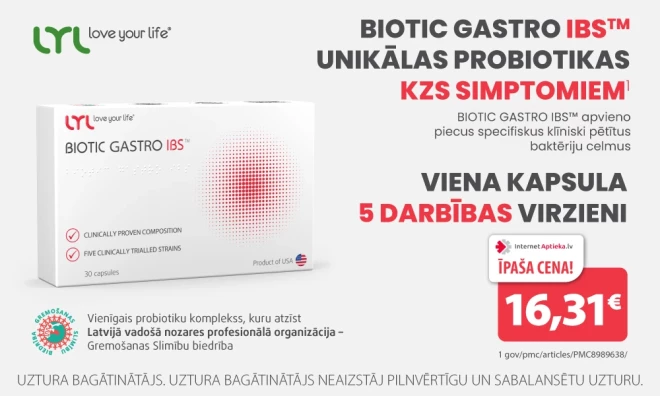 Ārste man pastāstīja, ka Latvijā ir pieejamas farmācijas zīmola LYL love your life® labās baktērijas BIOTIC GASTRO IBS™. Ar tām var mazināt KZS biežāk radītos simptomus. Produkts satur 30 miljardus baktēriju, un tā iedarbība ir pētīta gan preklīniskajos, gan klīniskajos pētījumos. Un tajos apstiprināts, ka uzlabojumi vērojami jau pēc 14 dienām. Šo produktu atzīst arī Latvijā vadošā gastroenteroloģijas nozares organizācija – Gremošanas Slimību biedrība.