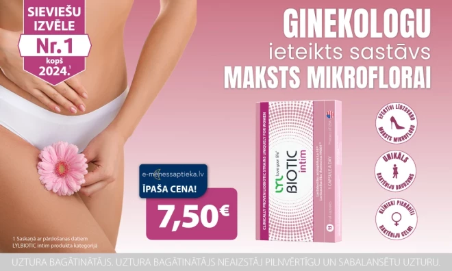LYLBIOTIC Drops atzīst arī lielākā profesionālā nozares organizācija Latvijā – Gremošanas slimību biedrība. Bet jums pašai noderēs Latvijā unikāls pienskābo baktēriju komplekss LYLBIOTIC intim – 12 mijardi vienā kapsulā –, kas satur veselīgas maksts vidē izplatītās L. acidophilus un L. rhamnosus baktēriju sugas. Līdzeklis ir klīniski pētīts, to apstiprina un atzīst Latvijas Ginekologu un dzemdību speciālistu asociācija. Iesaku arī tāpēc, ka LYLBIOTIC intim var turēt istabas temperatūrā un nēsāt līdzi jebkur, kur ejat.[4]”