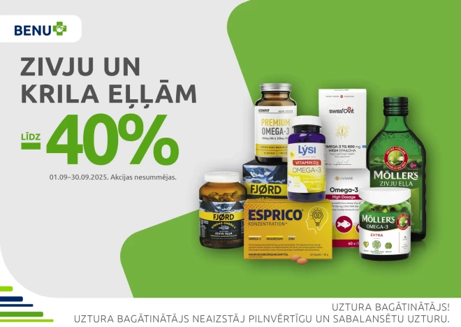 Visu septmebri klātienes BENU Aptiekās īpaši izdevīgas cenas dažādiem produktiem imunitātes stripināšanai un zivju un krila eļļām – ar atlaidēm līdz pat 40 %!