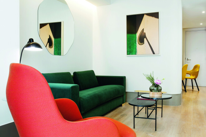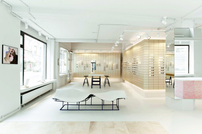 Tā viscaur baltais interjers – ar sofu, kuras dizains ir kaut kas starp utilitāru priekšmetu un mākslas objektu, centrā – drīzāk līdzinās mākslas galerijai, ne klasiskam optikas veikalam.