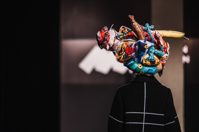 Iespaidīga ir arī Laimas Jurčas kolekcija "Jarmo". Kolekcijas pamatā ir melns, trausls tēls, ar lielu, krāsainu un apjomīgu galvas rotu, kas simbolizē spēju materializēt domas. Pamattēls ir minimālistisks, lai radītu kontrastu ar košo un iespaidīgo domu pasaules atspoguļojumu. Domu materializēšanās rezultāts ir acīm redzams, tas manifestē visu, no viskrāšņākajiem ziediem, līdz sarūsējušiem krāmiem - uzplaukst viss, kas domās krāts. Melno tēlu papildina balta līnija, kas rada kontrastu, sadalot tēlu konkrētās proporcijās. Kolekcijas apģērbos tiek izmantoti vilnas un vilnas/zīdu audumi, ko pati dizainere apdrukā izmantojot savu autortehniku. Manuprāt, brīnišķīgi realizēta kolekcija gan tērpu, gan krāsu, gan idejas ziņā.