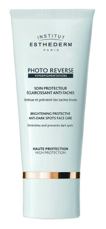 Institut Esthederm fluīds sejai ar pigmentācijas plankumiem Photo Reverse. Bloķē melanīna veidošanās procesu, mitrina, aizsargā ādu, pakāpeniski padara to gaišāku, pat atrodoties saulē. Piemērots kā ikdienai, tā pludmalei.
