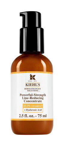 Kiehl’s serums Powerful-Strenght Line-Reducing. Iedarbīgs pretnovecošanas serums ar 12,5% C vitamīna koncentrāciju un hialuronskābi. Izlīdzina ādas toni, mitrina, piešķir ādai tonusu un starojumu. € 59.