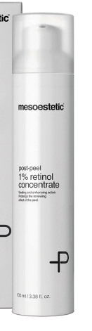 Mesoestetic retinola koncentrāts (1%) Post Peel. Uz retinolu balstītā formula stimulē kolagēna un elastīna sintēzi. Lietots pēc procedūrām, pagarina un paaugstina to pretnovecošanas iedarbību. Izlīdzina grumbas un uzlabo ādas elastību. € 62,25.