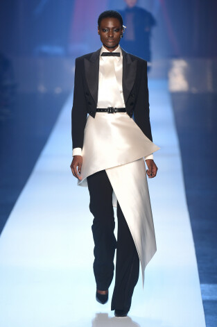 Jean Paul Gaultier smokingi pārtapuši par kleitām, bezpiedurkņu bikškostīmiem vai superseksīgiem šortiem.
