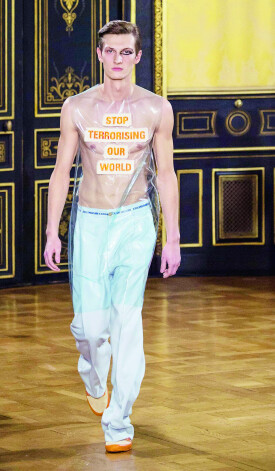 Walter van Beirendonck 2015. gada rudens/ziemas kolekcijas skatē, kas notika tikai divas nedēļas pēc teroristu sarīkotās apšaudes franču satīriskā laikraksta Charlie Hebdo birojā, Beirendonks atbildēja uz asiņaino uzbrukumu, uz caurspīdīgas tunikas rakstot: “Pārtrauciet terorizēt mūsu pasauli!”