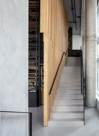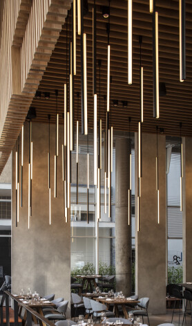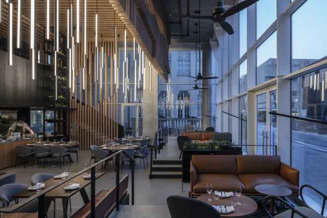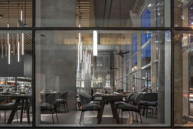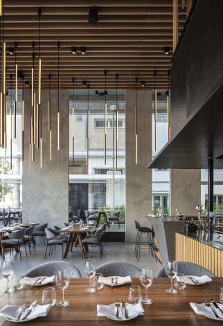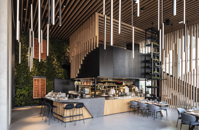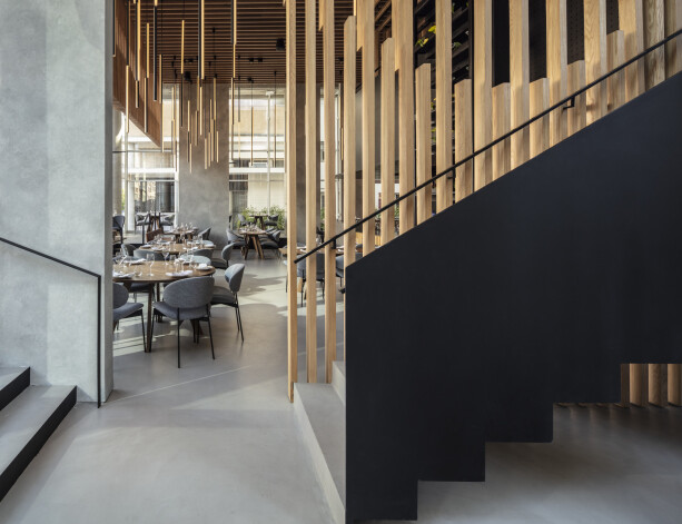 Restorāna interjeru veidojis arhitektu birojs Kimmel Eshkolot Architects, un tajā betona sienu industriālais skarbums laikmetīgi apvienots ar siltumu no dabiska, liekta koka, kura izmantojums telpā atgādina sirreāli dizainisku ribu vai ērģeļu stabuļu tīklojumu.