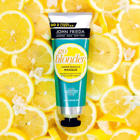 John Frieda līnijas Sheer Blonde Go Blonder citronu maska stiprina balinātus, trauslus un bojātus matus. Īpašā maskas formula aizver matu kutikulu un samazina to lūšanu, savukārt citronu eļļa gaišina.