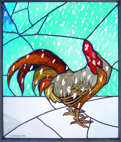 Šis ir viens no populārākajiem darbiem muzeja ekspozīcijā. Spilgts, izteiksmīgs, 20. gadsimta sākuma jūgendstilā ieturēts, tas uzreiz saista skatītāja uzmanību. Vitrāžas varonis – gailis ir arī viens no Rīgas simboliem. Turklāt šoreiz tas iekļauts nestandarta formātā – parasti gaiļus attēlo bravūrīgus un lepnus, uz vasarīgas ainavas fona, bet te putns teju ieputināts sniegā. Starp citu, šis gailītis izpelnījies lielu popularitāti Francijā (nav brīnums, jo tas ir arī franču nācijas simboliskais putns), kurp Kārlis Brencēns devās stažēties, tikko aizstāvējis Pēterburgas A. Štiglica Centrālās tehniskās zīmēšanas skolas diplomu. Vēlāk Kārlis Brencēns kļuva par Latvijas galveno vitrāžistu un darināja logu mākslas darbus gan patstāvīgi, gan pēc turīgu klientu pasūtījumiem (starp viņa talanta cienītājiem bija, piemēram, Benjamiņu pāris).