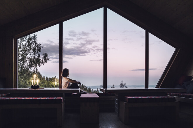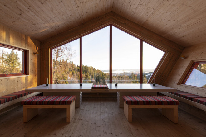 Kabīnes fasāde veidota no priedes koksnes, un arī pārējā ēkas apdarē izmantoti tikai vietējie materiāli. Aiz lielajiem logiem vīd pasakaina Oslo fjorda panorāma, katrs no logiem piedāvā citu skatu leņķi.