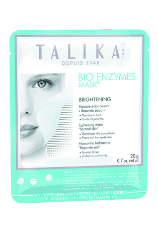 Talika balinošā biocelulozes maska Bio Enzymes. Satur B3 vitamīnu, augstas koncentrācijas hialuronskābi un alvejas ekstraktu ādas mitrināšanai, pelašķi, arniku, genciānu un kumelīti, kas nomierina un gaišina ādu. Izlīdzina tās toni un atsvaidzina 15 minūšu laikā. Cena: € 12.