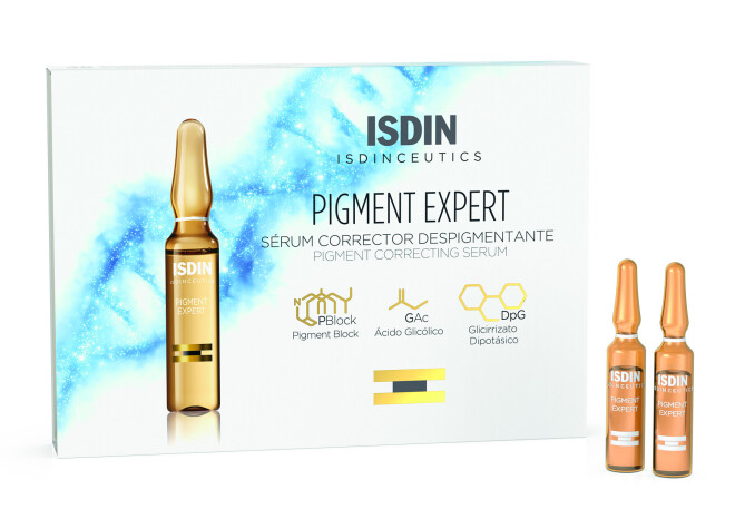 Isdin Isdinceutics koriģējošais serums Pigment Expert. Efektīva aktīvo vielu kombinācija palīdz novērst tumšo plankumu veidošanos un tos balina, padara ādas krāsu vienmērīgāku. Palīdz uzturēt mitruma līmeni un nomierina ādu. Cena: € 25.