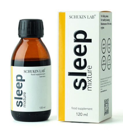 Schukin Lab Sleep Mixture sastāvā ir melisas, pasifloras un baldriāna ekstrakti, kas atslābina nervu spriedzi, melatonīns palīdz samazināt iemigšanai nepieciešamo laiku, nodrošina dabisku un veselīgu miegu. Cena: 13,50 €.