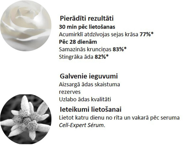Sastāva pamatā ir rozes cilmes šūnas apvienojumā ar skarbā klimatā augušā ēdelveisa ziedu ekstraktu – nepārspējams duets ar antioksidējošu spēku un bez brīvajiem radikāļiem. Sastāvu papildina vēl divas iedarbīgas aktīvās sastāvdaļas, kas palīdz samazināt un izlīdzināt krunciņas, kā arī uzlabo ādas elastību, stimulējot kolagēna sintēzi. Āda acumirklī pieplūst ar skābekli, kļūst stingrāka un gludāka. Ar katru dienu āda kļūst arvien skaistāka.
