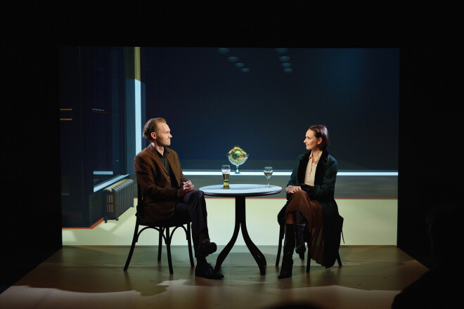 Nāves ēnā… Atceros, ka biju uzbūvējusi baltu telpu, pie aizmugurējās sienas mazs lodziņš, aiz tā – ūdens, centrā – milzīgs koka galds, un grīda lēnām grima. Ideja bija tāda, ka skatītājs raugās uz šo telpu un vienā brīdī saprot, ka knapi vairs redz aktierus, jo grīda grimst, grimst un grimst…