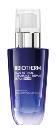 Nakts serums, kas, pateicoties lielai retinola koncentrācijai un Biotherm ekskluzīvajai sastāvdaļai Life Plankton™, sola acīmredzamu atjaunojošu efektu. Klīniskajos pētījumos 100% sieviešu novēroja grumbiņu samazināšanos un citu ādas kvalitātes parametru uzlabošanos. Biotherm Blue Retinol Night Serum Resurface + Repair piemērots normālai un taukainai ādai. Sāk ar divām lietošanas reizēm nedēļā, pakāpeniski palielinot biežumu līdz katram otrajam vakaram. Lieto pirms ādas mitrinātāja (nakts krēma). Cena: 88 € (30 ml).