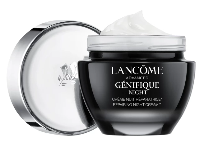 Lancôme Advanced Génifique nakts krēma unikālā spēcīgo aktīvo vielu kombinācija intensīvi atjauno un mitrina ādu. Dabiskās izcelsmes formula (94% dabiskas izcelsmes un 92% atjaunojamu sastāvdaļu) koncentrēta vieglā, elpojošā, taču bagātīgā tekstūrā, tā aktivizē ādas pašatjaunošanos, aizsargā un mitrina, aizkavējot novecošanas procesus. Cena: 108 € (50 ml).