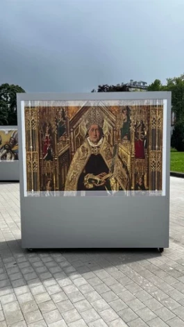 Ņemot vērā, ka izstādē attēlotas gleznas vai to fragmenti to oriģinālajā izmērā, ko pieļauj izstādes formāts, var gūt priekšstatu par iespaidīgo altārgleznu ar nosaukumu “Svētā Dominika no Silosas iesvētīšana bīskapa kārtā” (autors Bartolomē Bermeho), kas tapusi 15. gadsimtā un ir viens no reprezentatīvākajiem spāņu gotikas glezniecības darbiem.