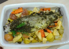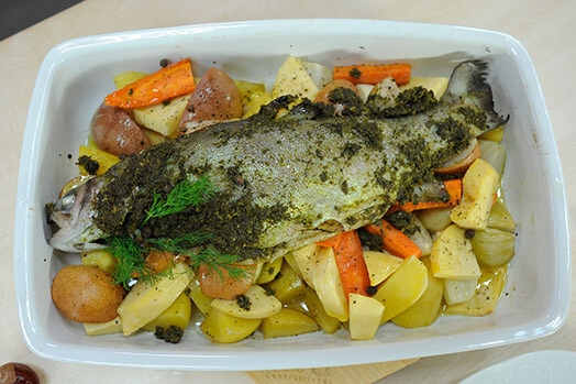 Kārtīgi nomazgātus kartupeļus nemizotus pārgriež uz pusēm, nolobītus sīpolus sagriež četrās daļās, burkānus gareniski uz pusēm un šķērsām, bumbierus četrās daļās. Liek cepešpannā kopā ar zivi. Zivi vēl pārklāj bagātīgi ar atlikušo zaļo garšaugu blenderējumu.