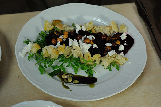 Pasniegšanai uz katra šķīvja kārto saplucinātu kressalātu “paklājiņu”, uz tiem pa vidu kā taciņu liek marinētās biešu šķēles, gar abām malām bietēm – maizes gabaliņus. Pārkaisa bietes ar sadrupinātu kazas sieru un pārber ar lazdu riekstiem.