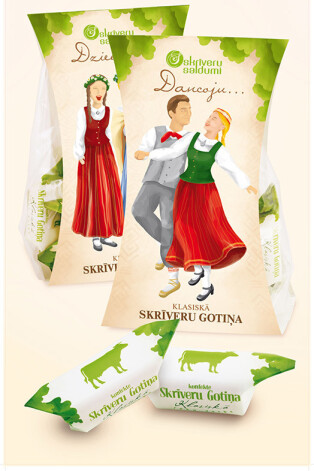 SIA „Skrīveru Saldumi” laidis klajā oriģinālus un ļoti mīļus saldumu iepakojumus ar Dziesmu svētku noskaņu – „DANCOJU”, „DZIEDĀJU”, kurā tiks iepakotas uzņēmumā ražotās bioloģiskā piena Gotiņas.